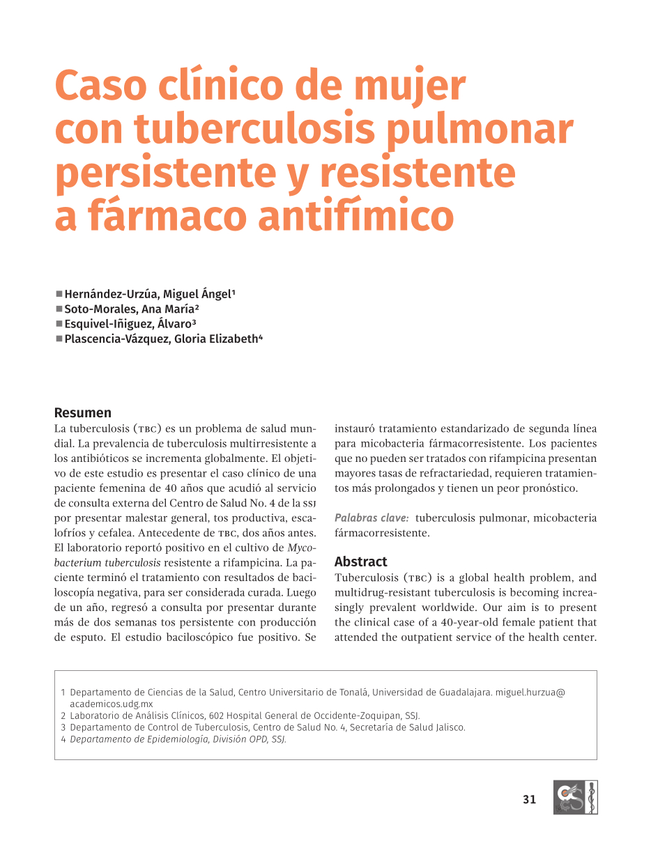 Resumen La tuberculosis (tbc) es un problema de salud mundial. La prevalencia de tuberculosis multirresistente a los antibióticos se incrementa globalmente. El objetivo de este estudio es presentar el caso clínico de una paciente femenina de 40 años que acudió al servicio de consulta externa del Centro de Salud No. 4 de la ssj por presentar malestar general, tos productiva, escalofríos y cefalea. Antecedente de tbc, dos años antes. El laboratorio reportó positivo en el cultivo de Mycobacterium tuberculosis resistente a rifampicina. La paciente terminó el tratamiento con resultados de baciloscopía negativa, para ser considerada curada. Luego de un año, regresó a consulta por presentar durante más de dos semanas tos persistente con producción de esputo. El estudio baciloscópico fue positivo. Se